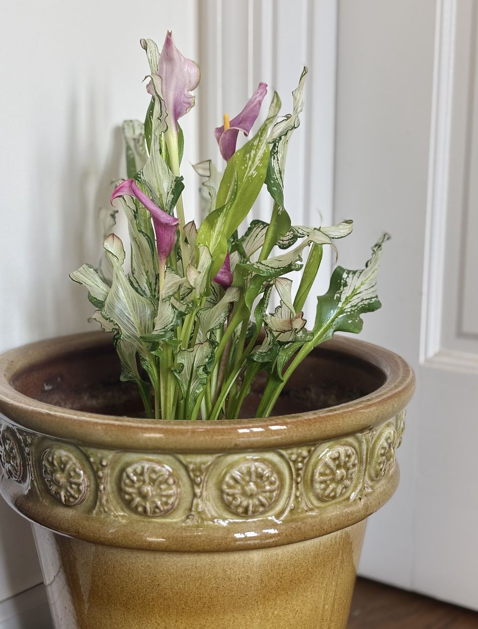 透明感のある斑入りの葉と花のコントラストにうっとり😍希少種カラー「フローズンクイーン」❄️👑