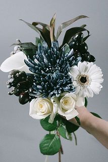 ブラックに染まった大輪マムやコニカルブラック、白バラの「アバランチェ」やカラーなど。シルバーブルニアを合わせておしゃれにまとめて😎