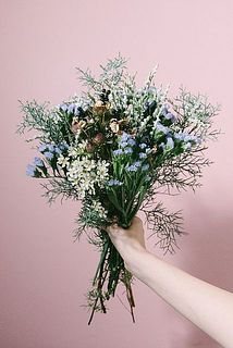 ブルーアイスやワックスフラワーなどすっきりとした香りが楽しめるアロマなブーケを束ねました🍃つやつやに黒く光るヒオウギの実をポイントに、季節のお花が楽しめます。