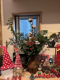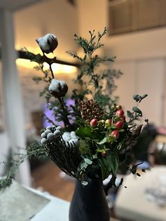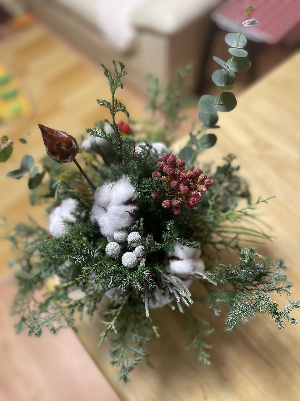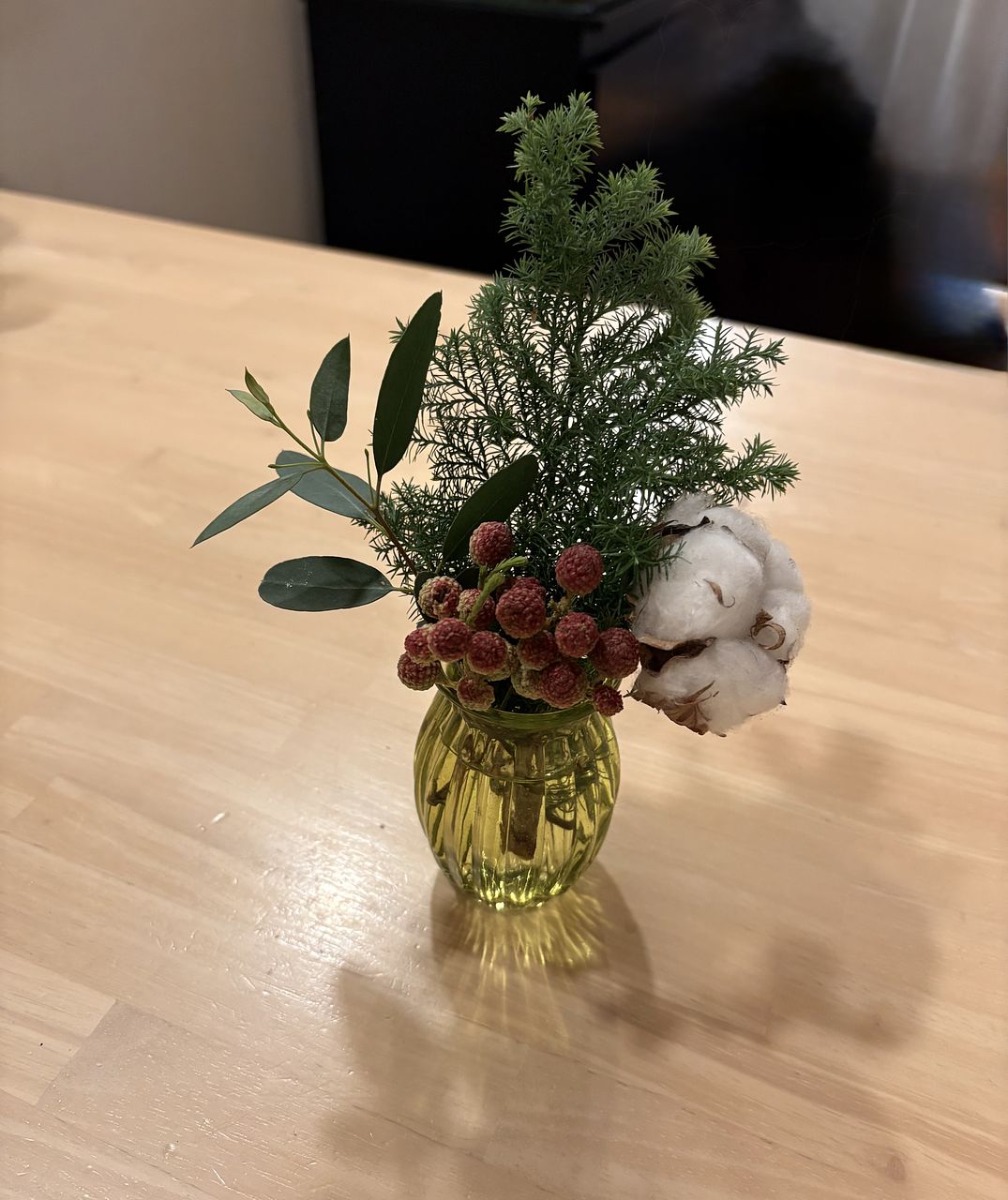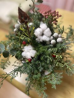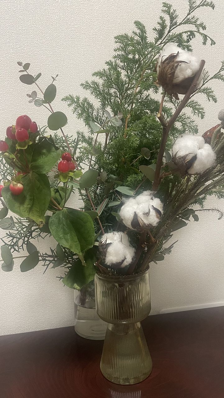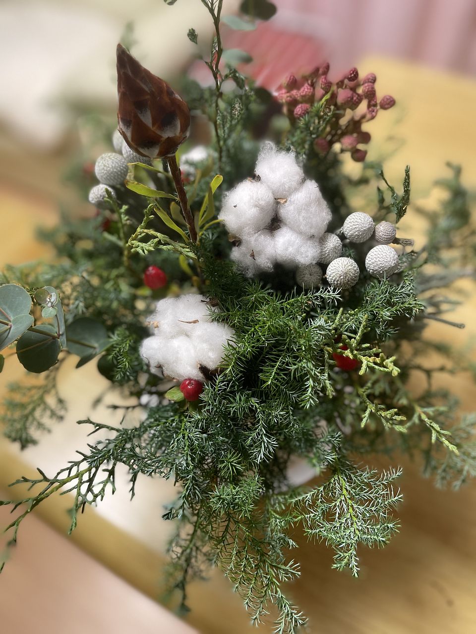 コットンとヒペリカムがアクセントになり、クリスマスらしい組み合わせでした🎄