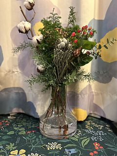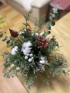 開けた途端に針葉樹の良い香り〜! ボリューミーでどの子も生き生きしていました。 アレンジメントにしましたが、グリーンを使いきれ無いぐらいのボリュームでした。 コットンフラワーは水につけない方が良いとの事なので ワイヤリングして挿しています。