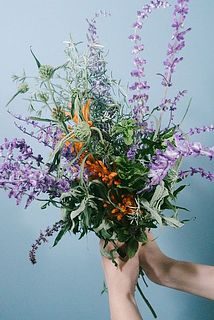 もこもこ質感のレオノチスやセージの香りは、思わず深呼吸したくなるはず。パープルとオレンジのカラーリングがかわいすぎる!今のシーズンにぴったりのブーケです。