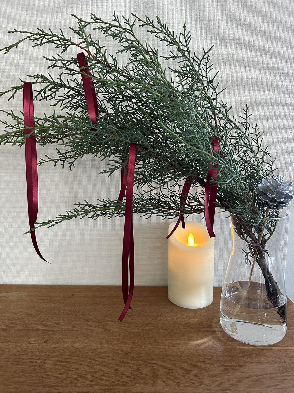 ボリュームたっぷりなので半分はリースに残りは花瓶に挿して飾ります 手にヤニが付いてなかなか大変ですね
