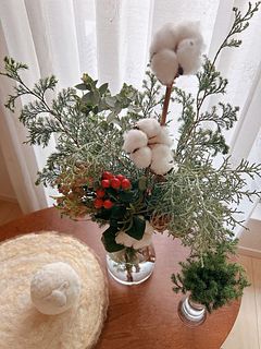 数日間花瓶に飾ってからスワッグにしました。 ボリュームたっぷりでコットンも可愛くて大満足です。このお値段で、生の木の香りを楽しめるスワッグが飾れるなんて!ありがとうございます。 来年も期待してます!