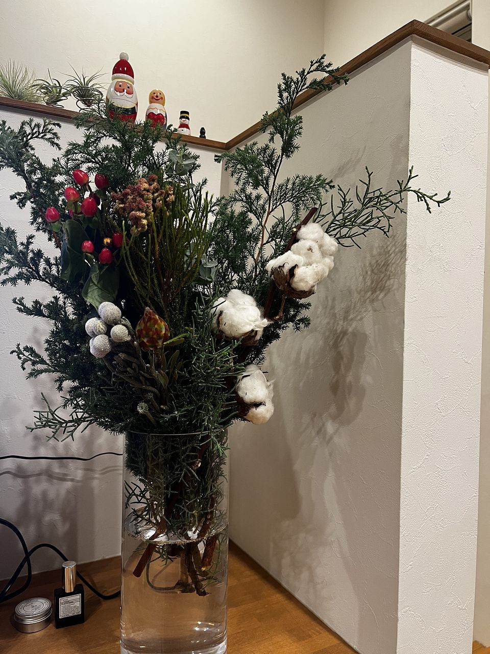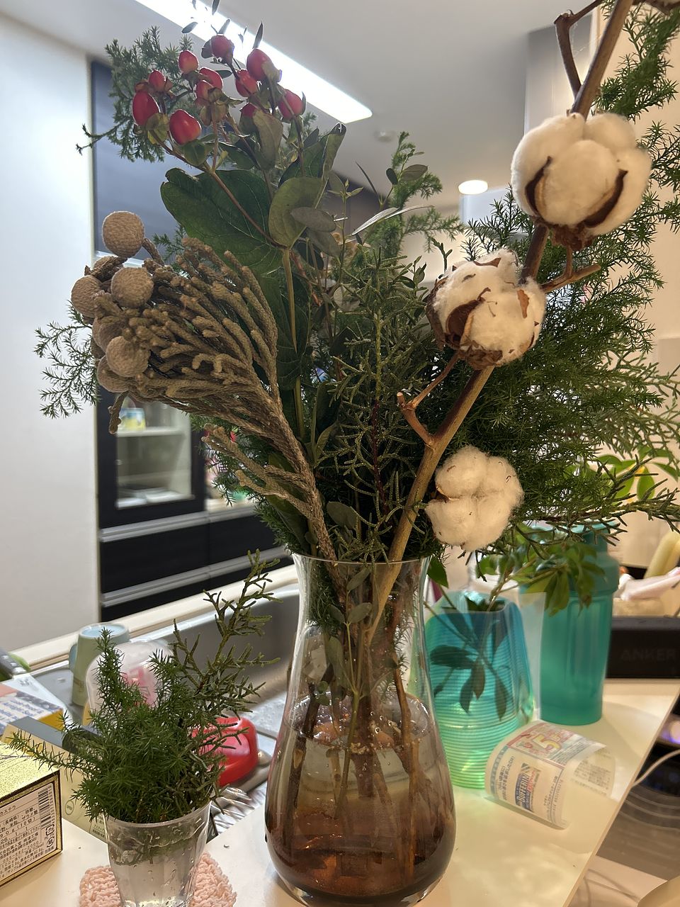 コットンとヒペリカムがアクセントになり、クリスマスらしい組み合わせでした🎄
