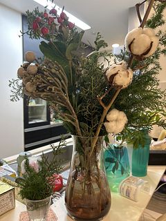 開けた途端に針葉樹の良い香り〜! ボリューミーでどの子も生き生きしていました。 アレンジメントにしましたが、グリーンを使いきれ無いぐらいのボリュームでした。 コットンフラワーは水につけない方が良いとの事なので ワイヤリングして挿しています。