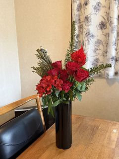 前回はかわいい系のローズを購入したので、今回はクリスマスカラーの赤で大人っぽい空間を作りたくて購入しました。お花は6本あり問題はなかったのですが、バラの葉が到着時かなり元気がなくカラカラになっており、水揚げを2時間しましたが葉はあまり元気がなかったのでかなり外しました。ボリュームが減ってしまったので、グリーンか枝物を追加しようかと考えています。赤い薔薇を購入したのは初めてですが、深い赤が素敵だと思います。花瓶も一緒に購入しました。箱から出した時には大きい!と思いましたが、とても安定感があるので使いやすいと思います。