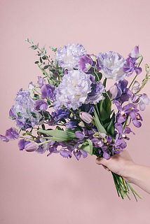 トルコキキョウ「ボヤージュブルーシェイク」やチューリップ「パープルスカイ」、モカラ「ライラックブルー」などをたっぷりと束ねて。甘い香りのスイートピーもぜひ楽しんで。