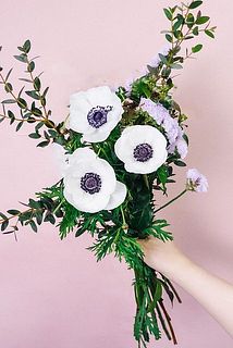 珍しいアネモネ「ホワイトブラックセンター」をメインに束ねました。なかなか出回らない希少な品種です。ユーカリやビバーナムのナチュラルなグリーンもたっぷり楽しんで🌿