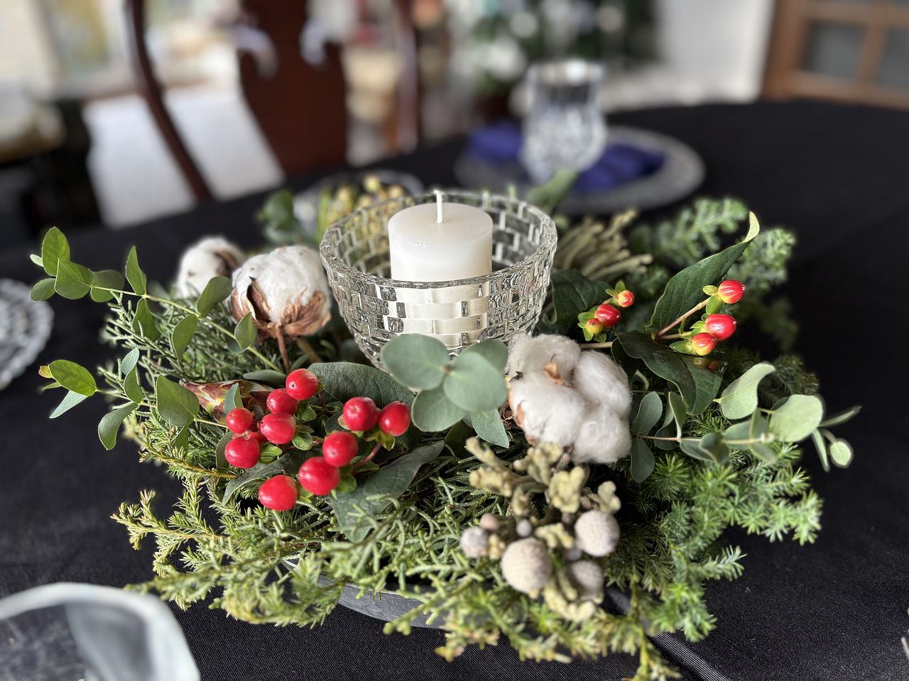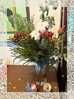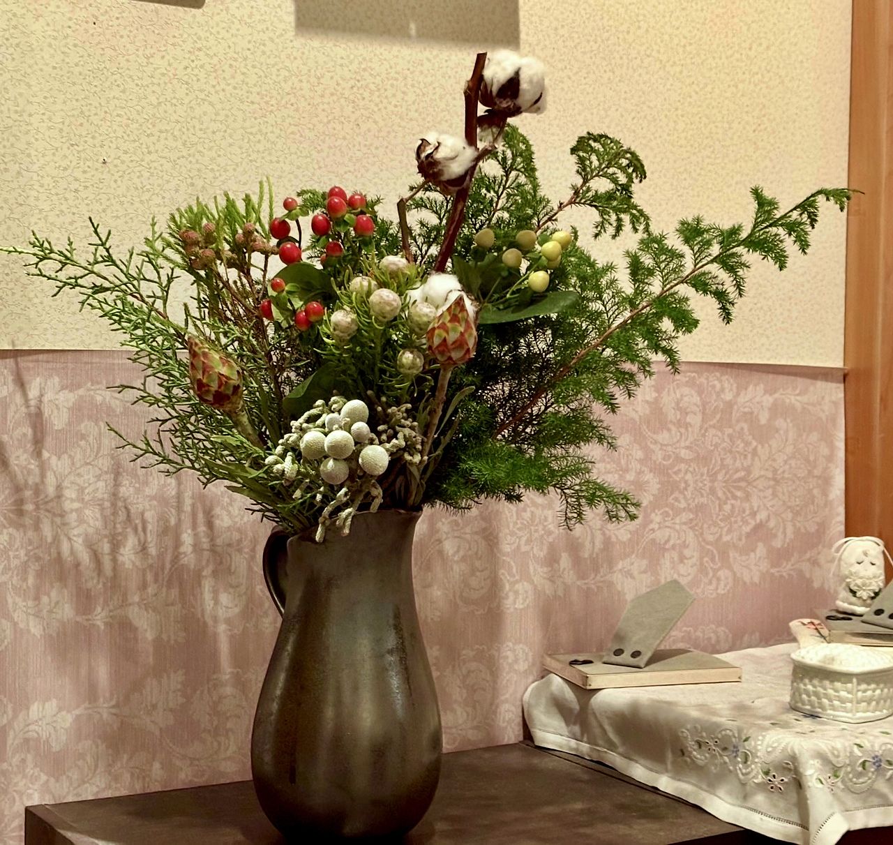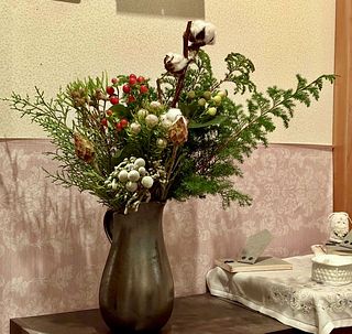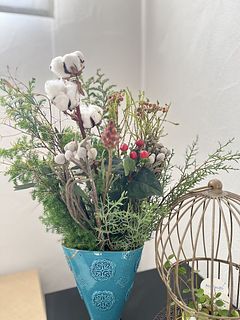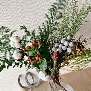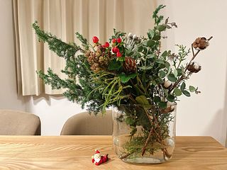 単品では買えないいくつもの種類の枝物、花、実が揃っていて活けるのが難しくも楽しかったです。ばらんすを取るために一緒に購入した『ホワイトクリスマス』から三本こちらに使いました。部屋に飾ったあと、クリスマス会の日にはリビングに移しましたが、控えめな存在感が大人の集まりにはちょうどよかったです。