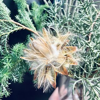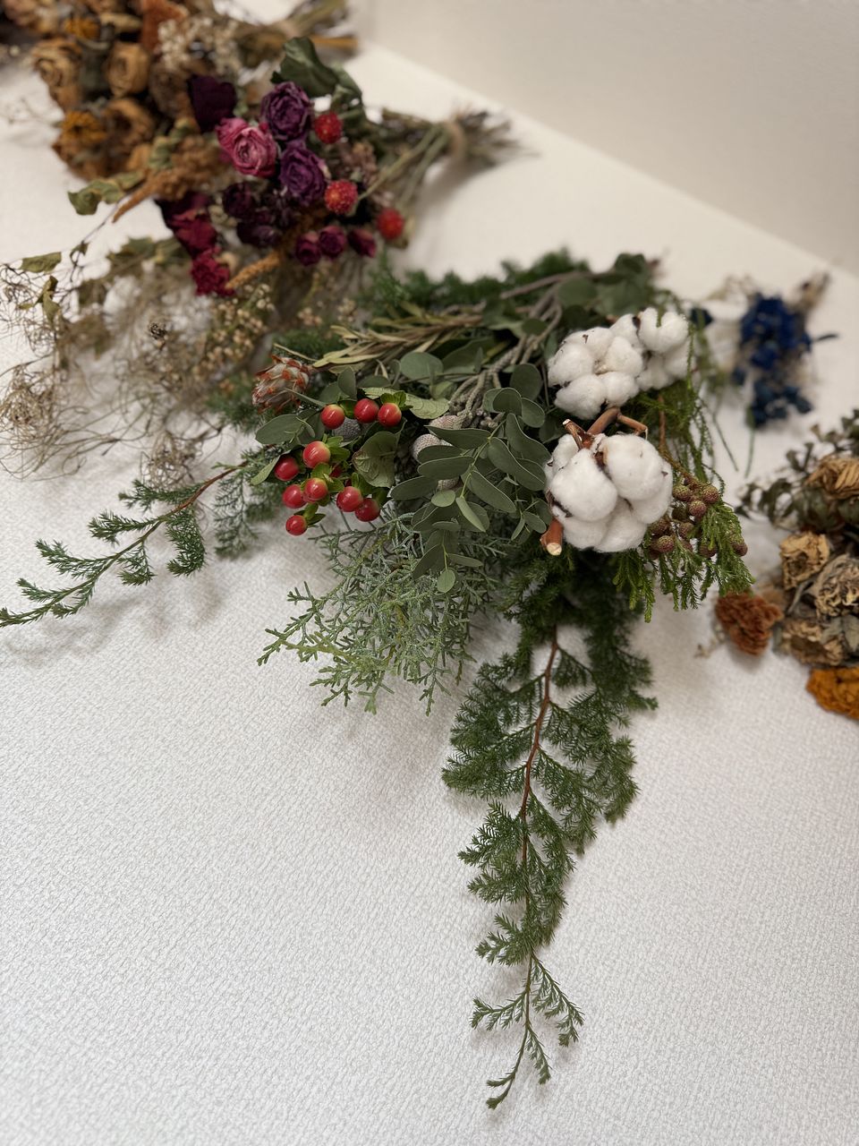 珍しい花もあり綿毛がクリスマス気分になります 小さいスワッグも作ってみます