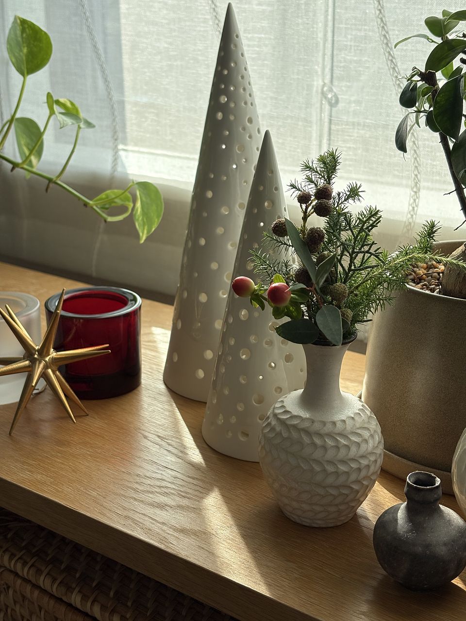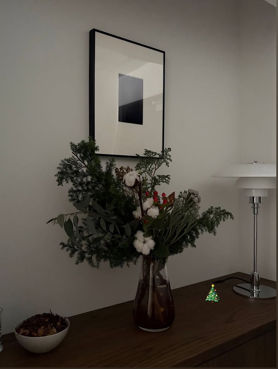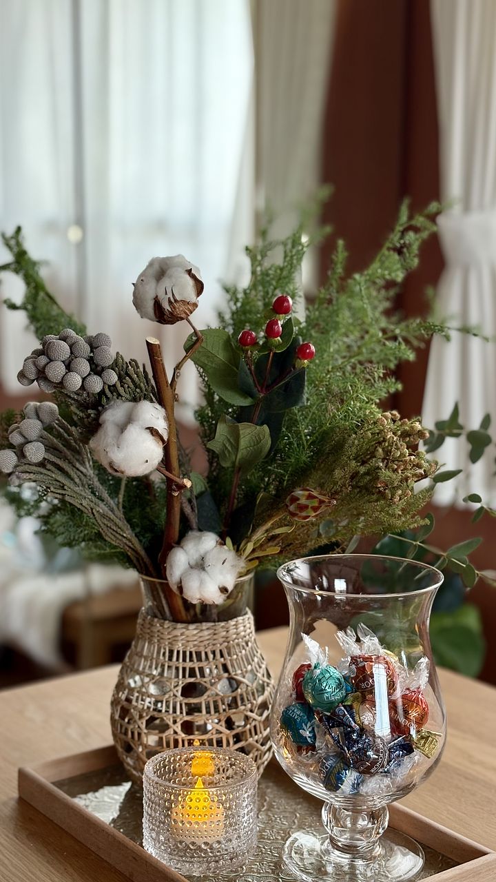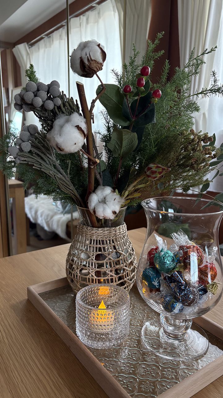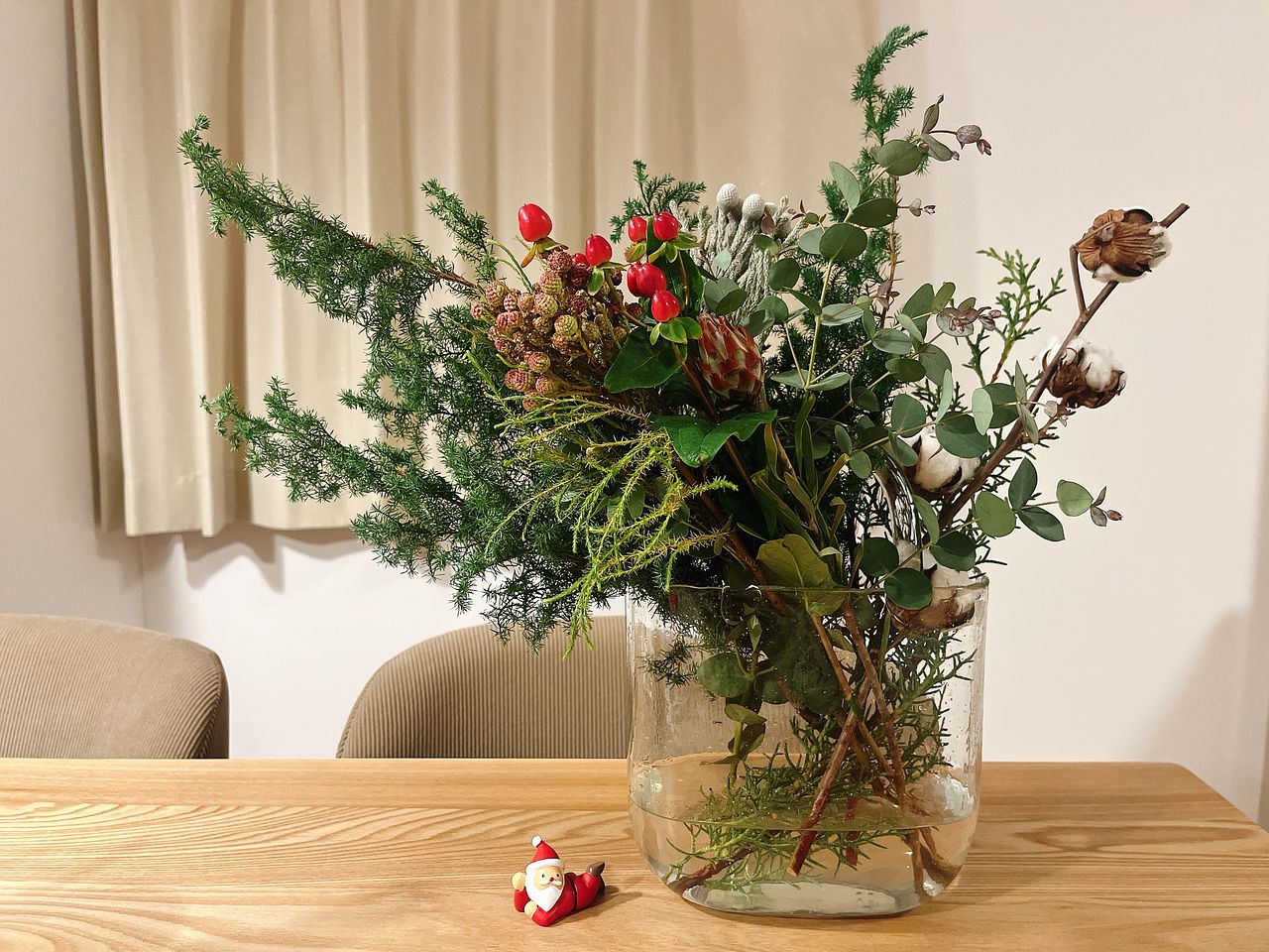 いつものことながら今回もものすごいボリュームに驚きました🫢フラワーベースにいろいろ飾って楽しんでいます🤗クリスマスの雰囲気が部屋中に広がりました🎄