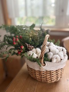 とても新鮮なグリーンが届きました🎁 スワッグにしようと思っていましたが、テーブルに飾りたかったので籠仕立てにしてみました。 素人のアレンジすみません💦 自己満足です🎄