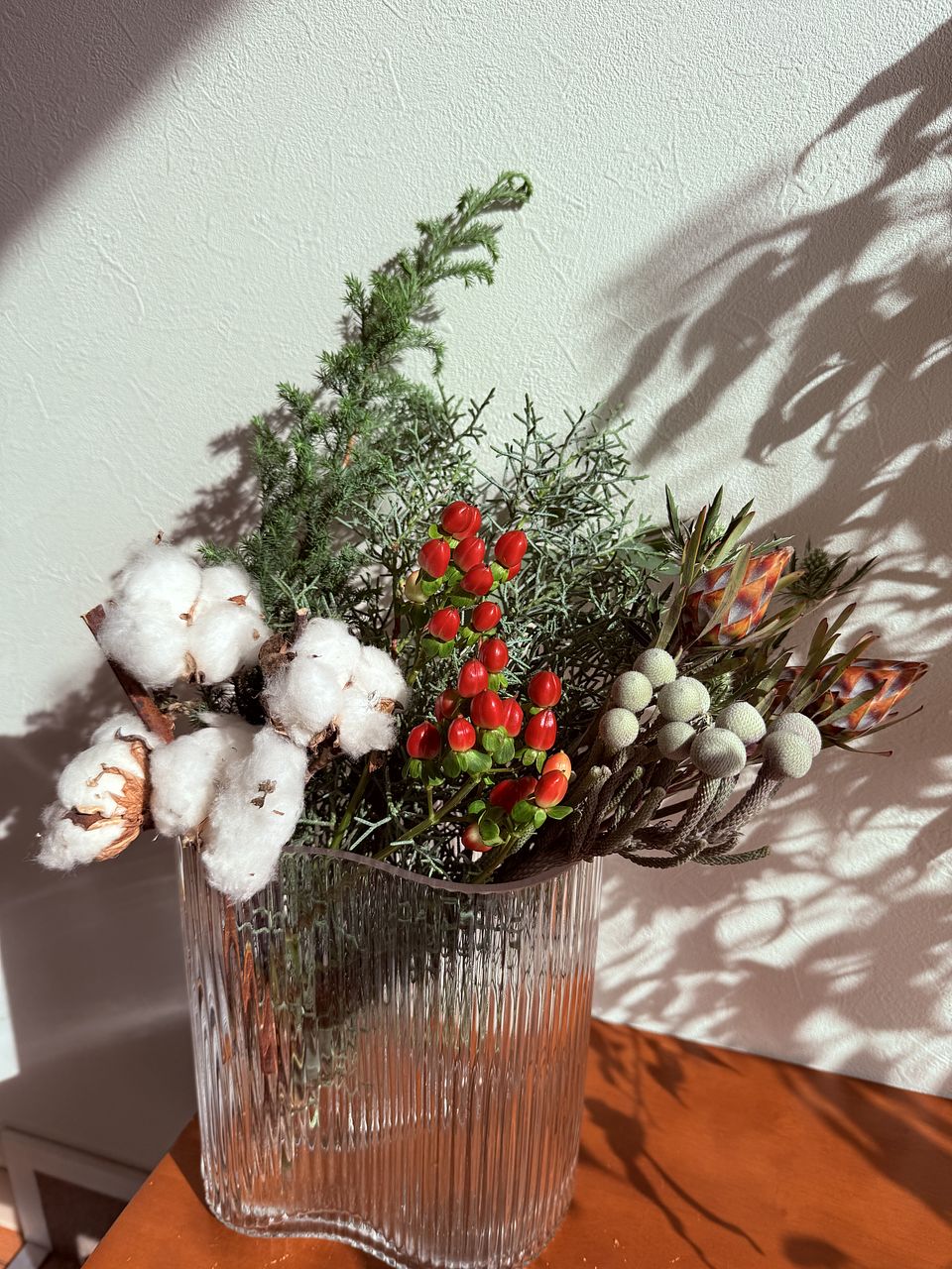 針葉樹のいい香りがします。 生けるバランスが難しくなかなかしっくりこないのですが、あえて短めに生けてとりあえず落ち着きました。 長く楽しめそうなのでお世話をしながら納得のバランスを見つけたいと思います。 今回はドライにはせずフレッシュのまま飾りたいと思います。
