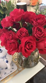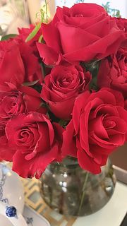 前回はかわいい系のローズを購入したので、今回はクリスマスカラーの赤で大人っぽい空間を作りたくて購入しました。お花は6本あり問題はなかったのですが、バラの葉が到着時かなり元気がなくカラカラになっており、水揚げを2時間しましたが葉はあまり元気がなかったのでかなり外しました。ボリュームが減ってしまったので、グリーンか枝物を追加しようかと考えています。赤い薔薇を購入したのは初めてですが、深い赤が素敵だと思います。花瓶も一緒に購入しました。箱から出した時には大きい!と思いましたが、とても安定感があるので使いやすいと思います。