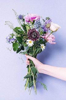 スイートピー / トルコキキョウ / ギリア / アイリス / カーネーション / スカビオサ / マーガレット / ミヤコワスレ / へデラベリー / ソリダスター