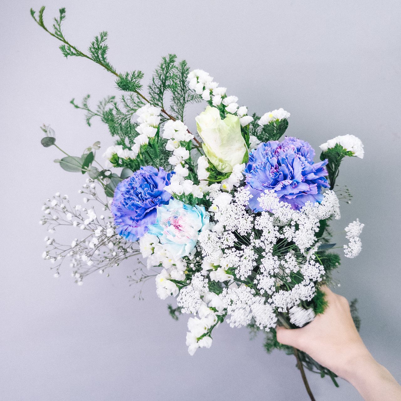 ひんやりかわいいブルーとホワイトのお花を集めたおまかせブーケ⛄️どんなお花が届くかは、箱を開けるまでのお楽しみ。