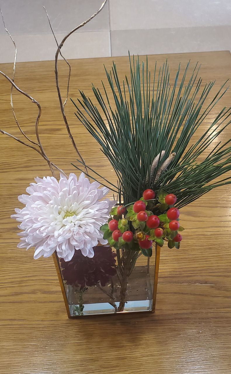 マム / ハボタン / チューリップ / 松 / ヒペリカム / ユーカリ