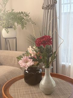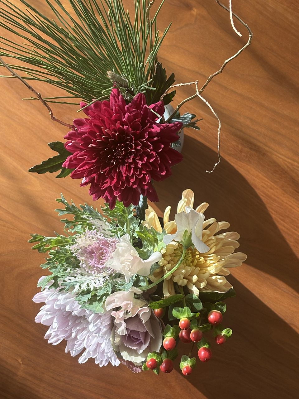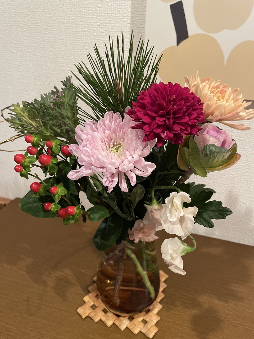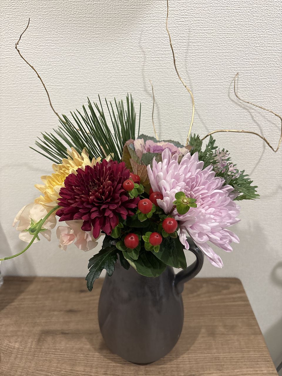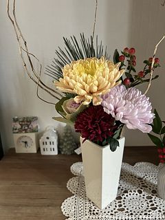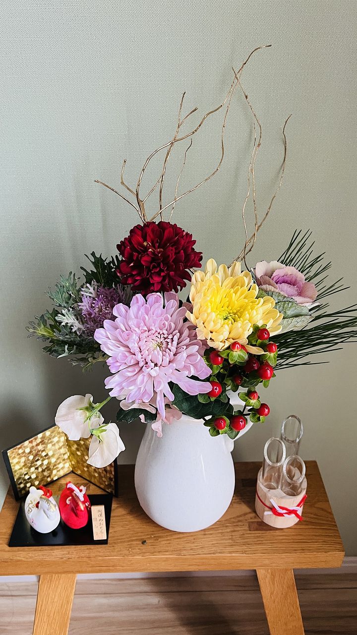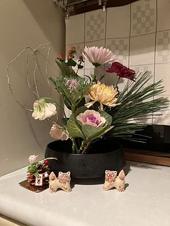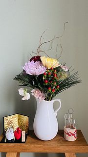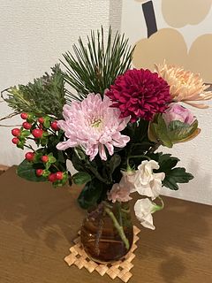 三色の菊も、二種類の葉牡丹も、とても新鮮で素敵でした。特に葉牡丹はどちらもやさしい色合いでうっとり。届いたら水揚げして、大晦日の今日まで涼しい部屋で保管しておいたので、フレッシュな状態が保たれました。満を持してリビングに飾り、新年を華やかに迎えられそうです。 【追記(写真2枚目)】 届いてから約2週間が経ちました。葉牡丹とマムは萎れたり枯れたりしてしまいましたが、いくつかはまだ頑張ってくれています。残ったもので生け直して、もうしばらく楽しみます。