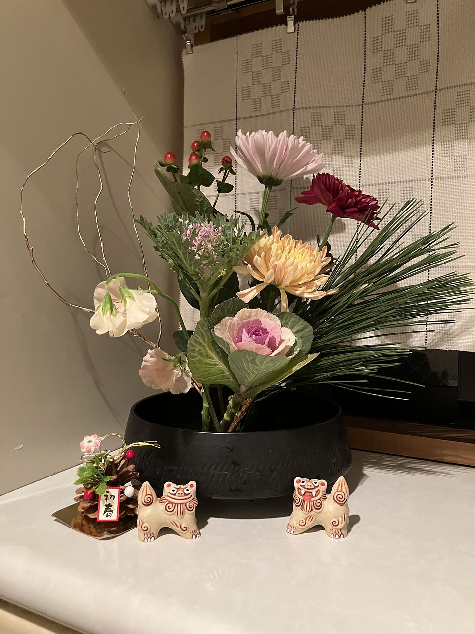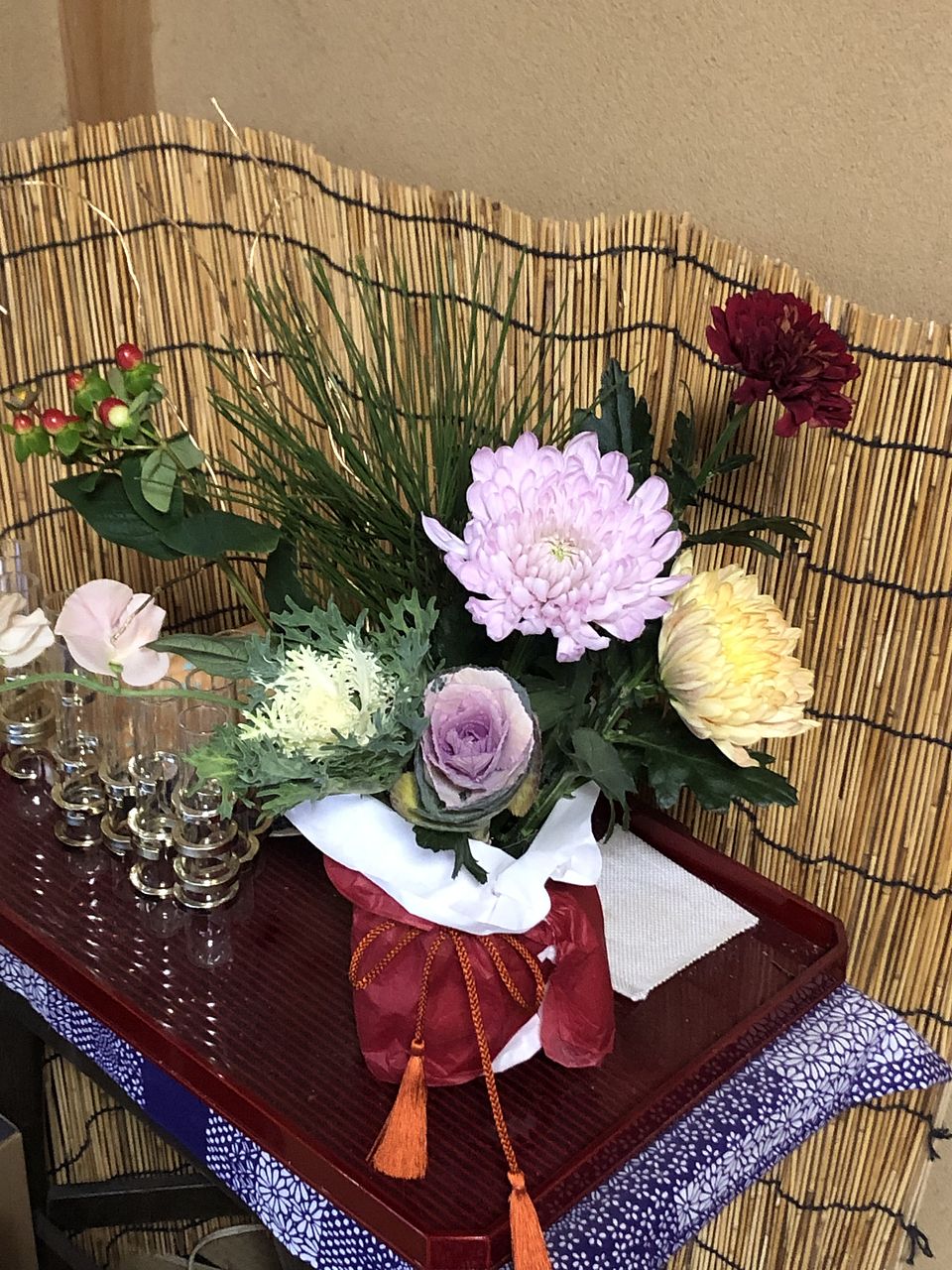 ボリュームもちょうどよく、よい色合いのお花でした。わが家の花瓶はガラス製なので、半紙と包装紙でラッピングして新年らしいしつらいにできました