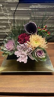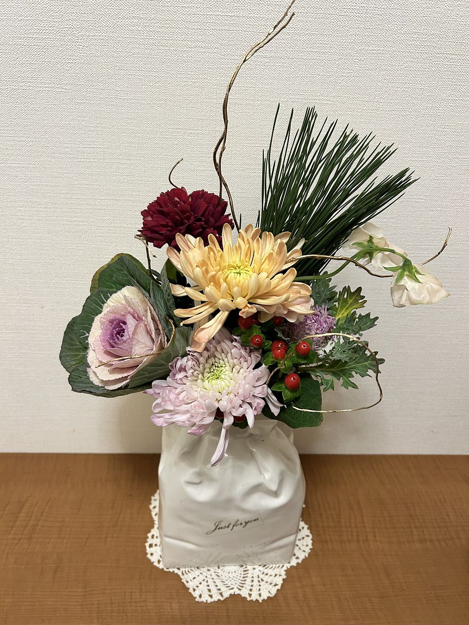 葉牡丹が茶色くなっており、5枚ほど取りました。そのため、かなり小ぶりとなってさしまいました。それ以外は菊も大ぶりで、イメージとおりでした。