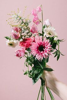 スイートピーの花言葉は「門出」、ピンクのバラの花言葉は「感謝」「かわいい人」ガーベラの花言葉は「希望」「前向き」。