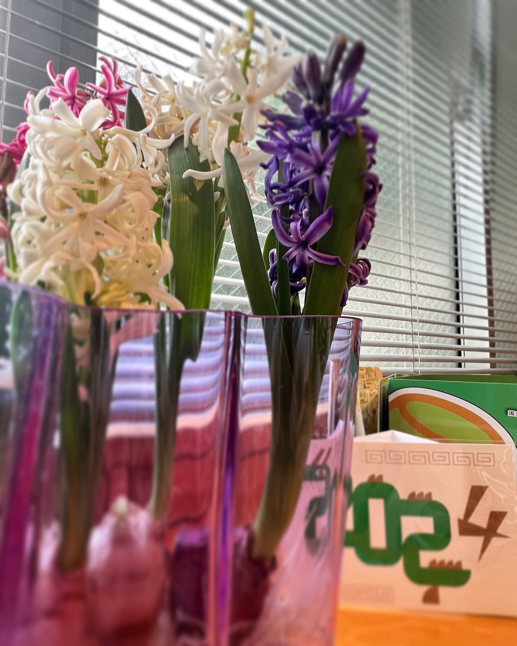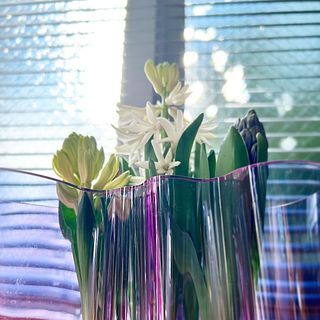 大きめのフラワーベースに四つの球根がちょうど良いボリュームでした。 窮屈っぽい感じでベースにギュッとフィットしたまま育つと、生花のような感じもしました。日によって、或いは気分によって様々な雰囲気を楽しめました。