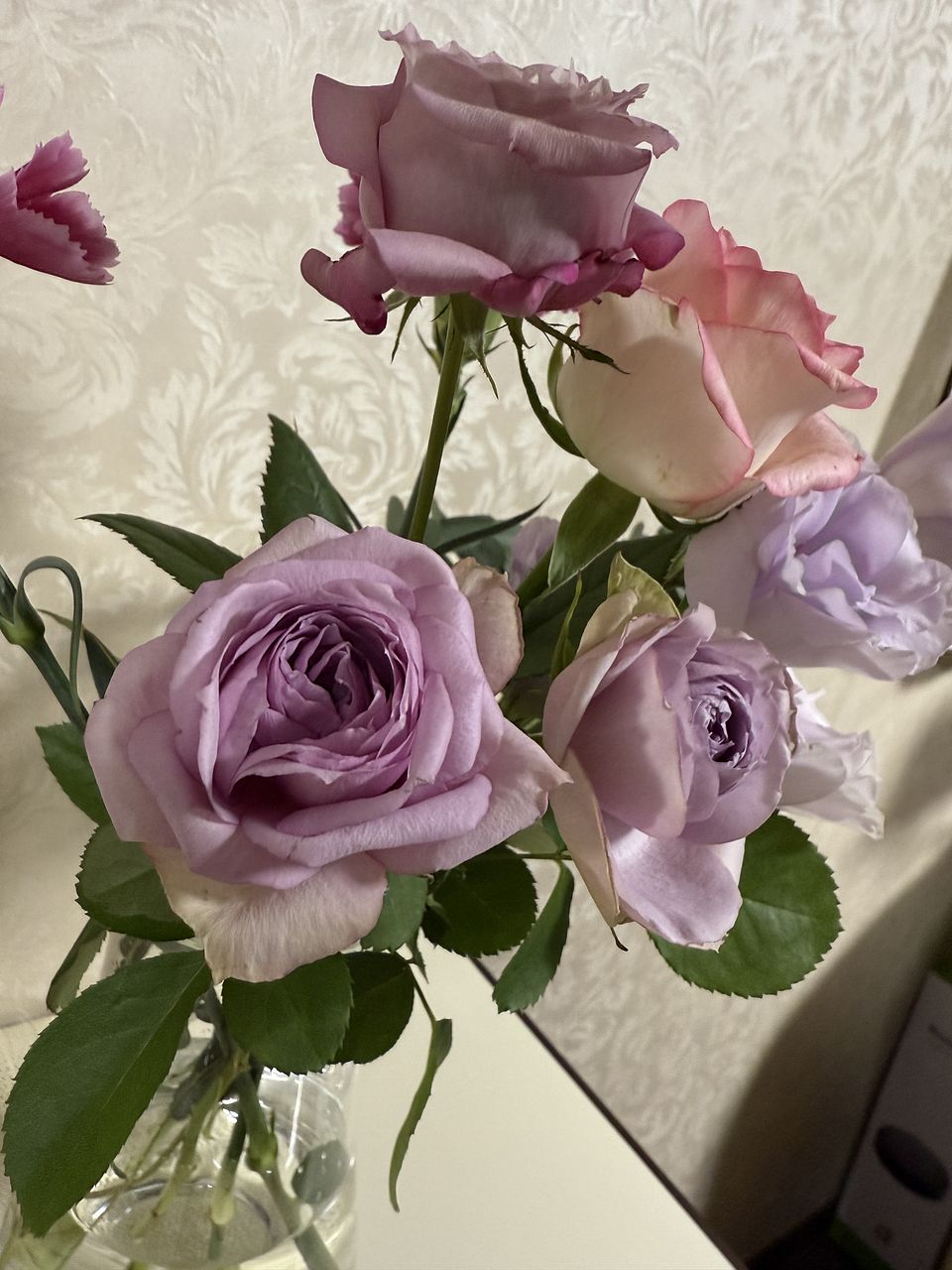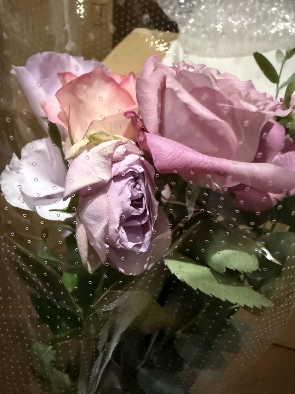 ラベンダーカラーのトルコキキョウにアンティークカラーのバラをたっぷりと束ねました😌