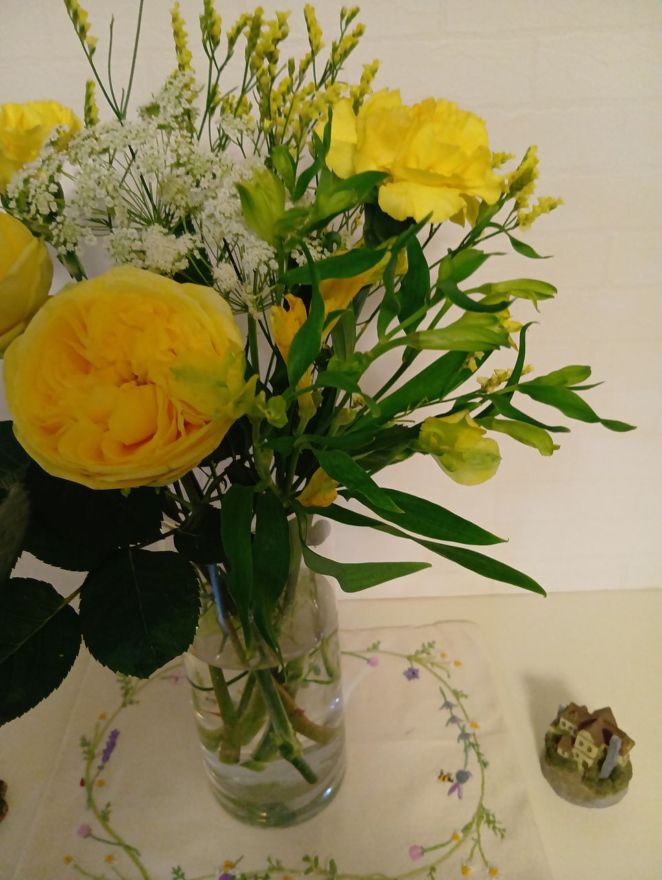 スターチスがかなり盛りだくさんでした、花びらの重なった八重咲きの薔薇が素敵、ミモザは色が濃くなった盛りがちょっと過ぎたもの、でも黄色のコントラストになって可愛い感じでした。