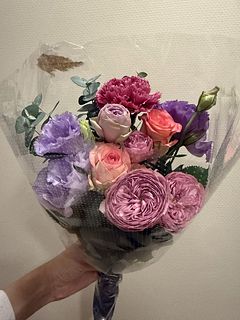ラベンダーやシックなパープルカラーのスイートピーにアンティークカラーのバラをたっぷりと束ねました😌