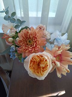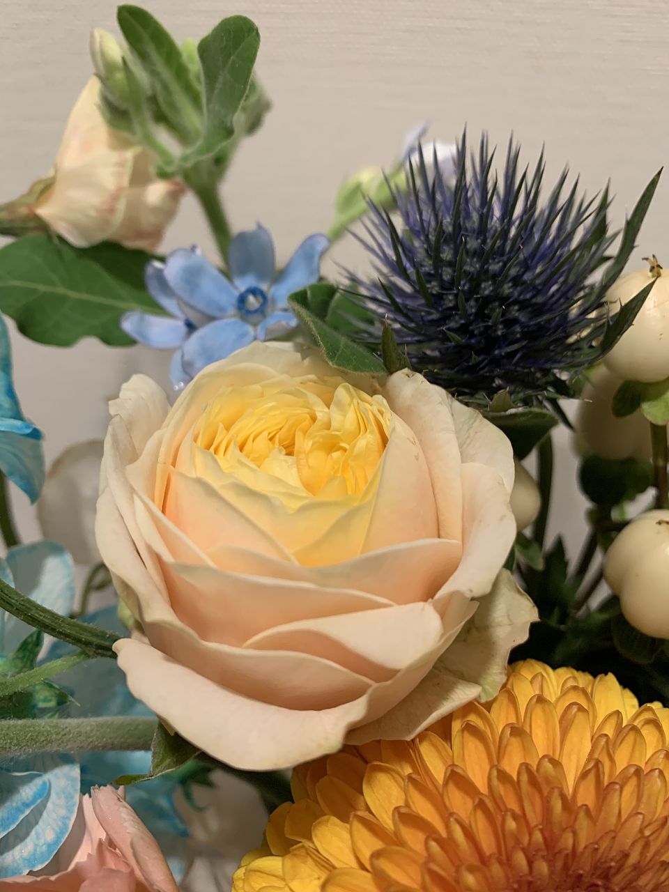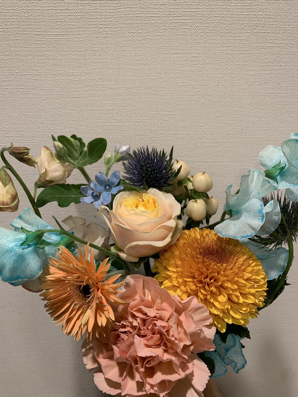 アプリコットカラーとブルーのバランスが素敵だなと思って購入しましたが、思っていよりアプリコットではなく、ピンクやオレンジが強めでした。どうしてもイメージは主観なので、違ったなというだけで、これはこれで素敵なお花でした。