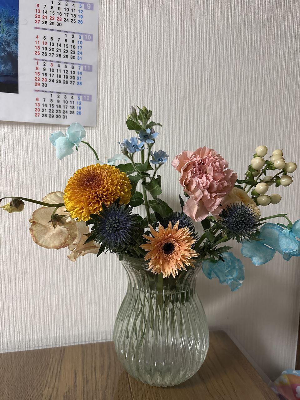 思ったより濃いめの色の印象ですが、ボリュームがすごいです。ブルースターが入っているのがとても嬉しかったです。 スイートピーの香りがとてもよく、お部屋にあるだけで気持ちも華やぎます。 明日以降また落ちついて活けるのが楽しみです。