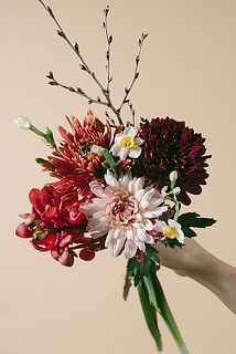 ダリアのような華やかさのマム「ラベロ」「トゥーラカーメラ」や、シックな赤が魅力のモカラ「ルビーレッド」、上品な「日本水仙」、「啓翁桜」を組み合わせて華やかに束ねました🌸