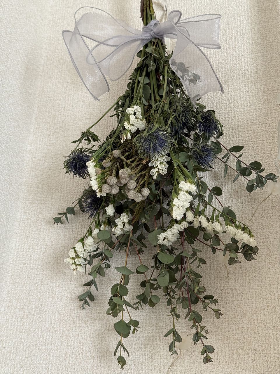 エリンジウムは小ぶりでしたがまあまあボリュームもあり、綺麗なお花とグリーンでした! ドライにしたかったのですぐにカーテンレールにぶら下げました