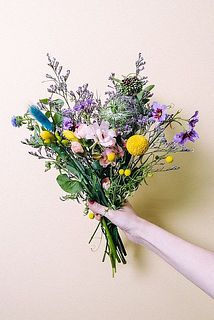 ビーンズリーフ / アリウム / ラナンキュラスまたはカーネーション / リューココリーネ / スプレーカーネーション / フリージア / アルストロメリア / バニーテール / 豆の花 / クラスペディア / セファロフォラ / ギリア / ハイブリッドスターチスなど