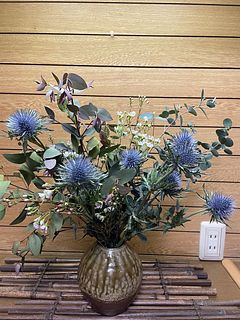 家族に華がないと言われてしまった。確かにユーカリの葉っぱがちょっと緑では無かったりしたので暗い感じだった。 エリンジウムも二本だったからかあまり目立たなかった。