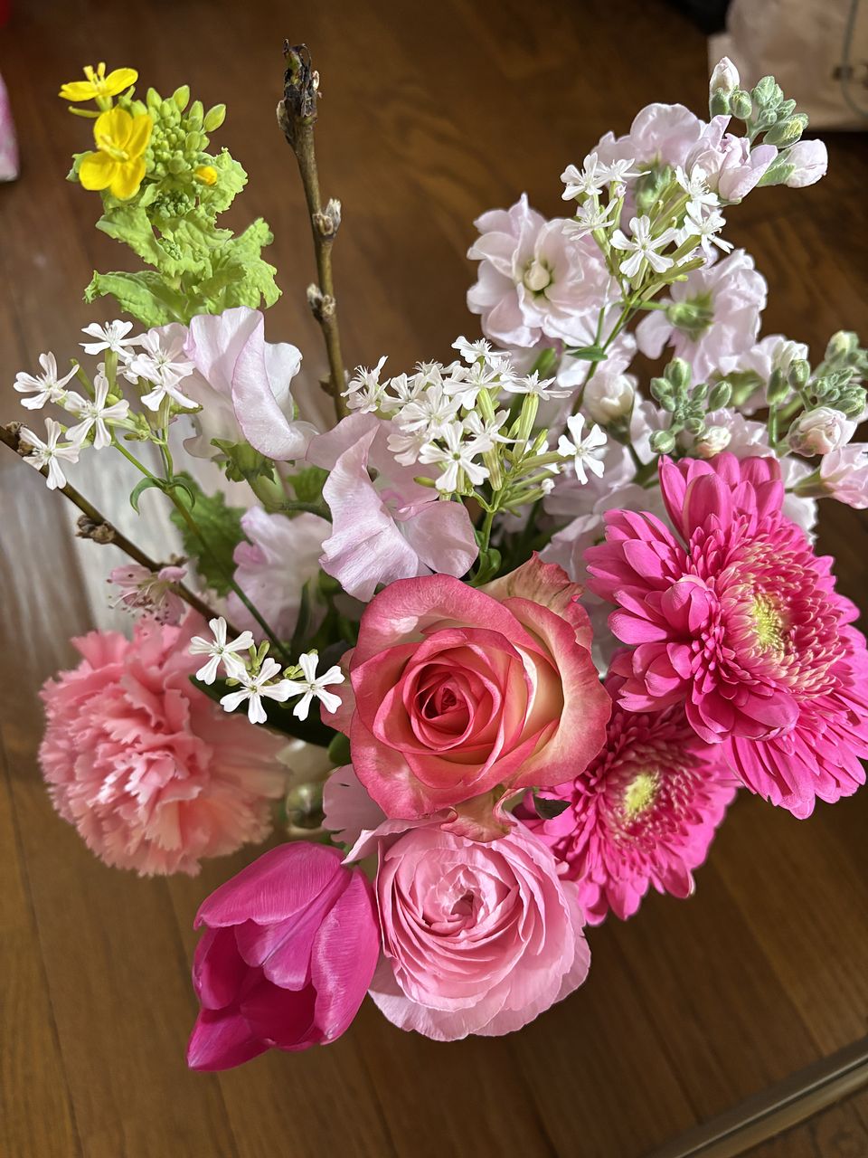チューリップ、ラナンキュラス、スイトピー、 バラ、ガーベラと色んなお花が入っていました。 全体的にピンクですが、濃い色もあってバランスが良いです。桃がもう少し太いしっかりしたサイズだともっといいのですが、、、 菜の花の黄色が咲いてくれると嬉しいです。 今は一つだけです。