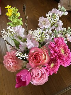 チューリップ、バラ、ガーベラ、ラナンキュラス、カーネーション、スイートピー、桃などピンク系のグラデーションが届いてお部屋が一気に春らしくなり、気分が上がりました!ありがとうございます😊