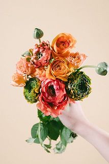 ふりっふりの花びらと複色カラーリングがおしゃれ。ポンポン咲きのラナンキュラス「ミネルバ」や「メルリーノ」などを束ねたアプリコットブーケ🍊🧡