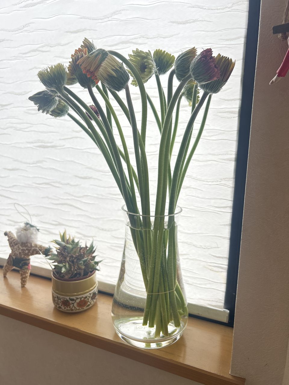 蕾のガーベラを初めて購入したのですが ちゃんと咲いてくれてとてもパワーがもらえました。