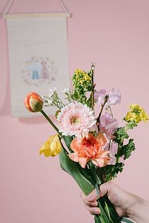 刺繍でつくられた、おだいりさまとお雛さまのタペストリーと春のブーケと一緒に飾ってみるのはいかが?🍑