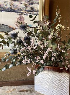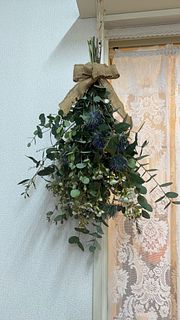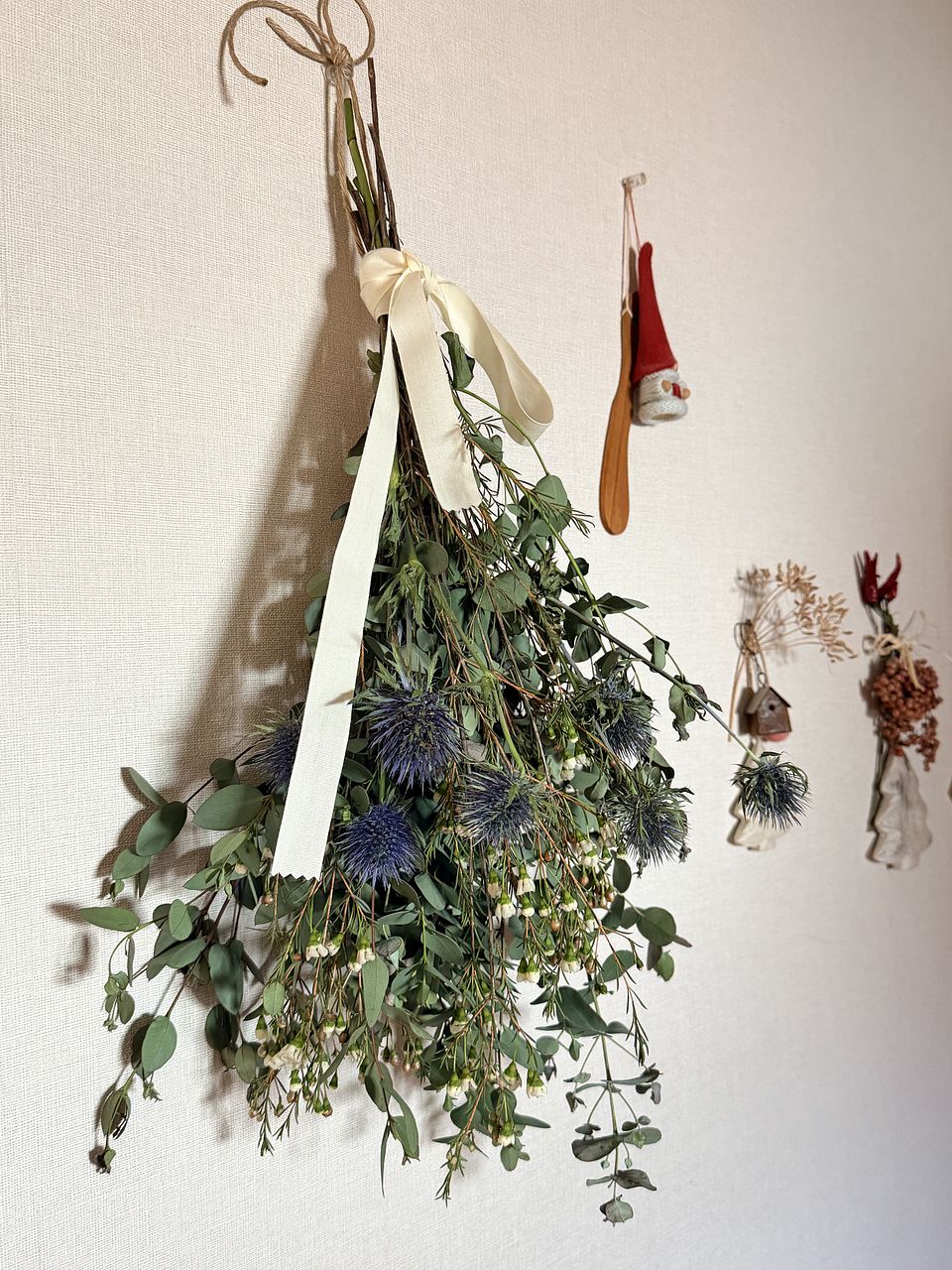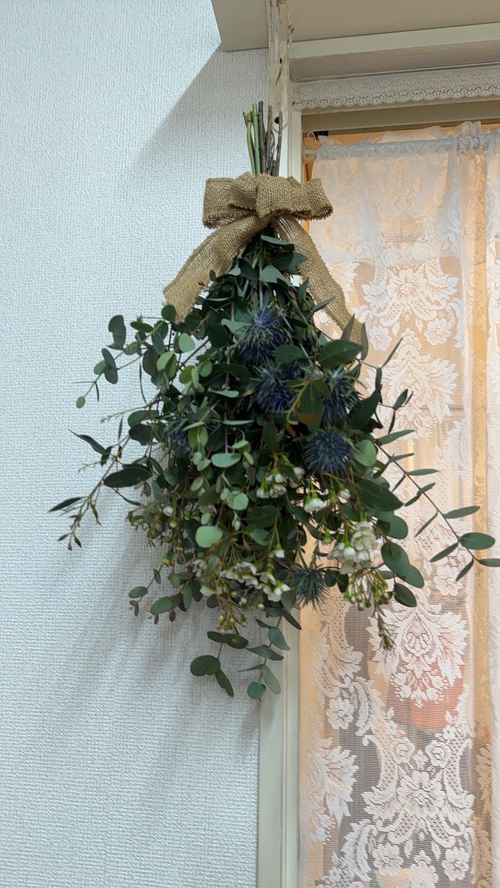 ワックスフラワー、エリンジウム、ユーカリ全部大好き🥰スワッグにしてうまくドライになるといいなぁ。