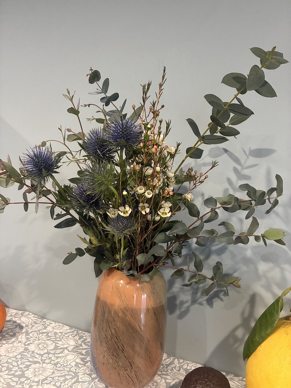 エリンジウムの青色が好みです。全体にシックな色合いがまた素敵です☺️