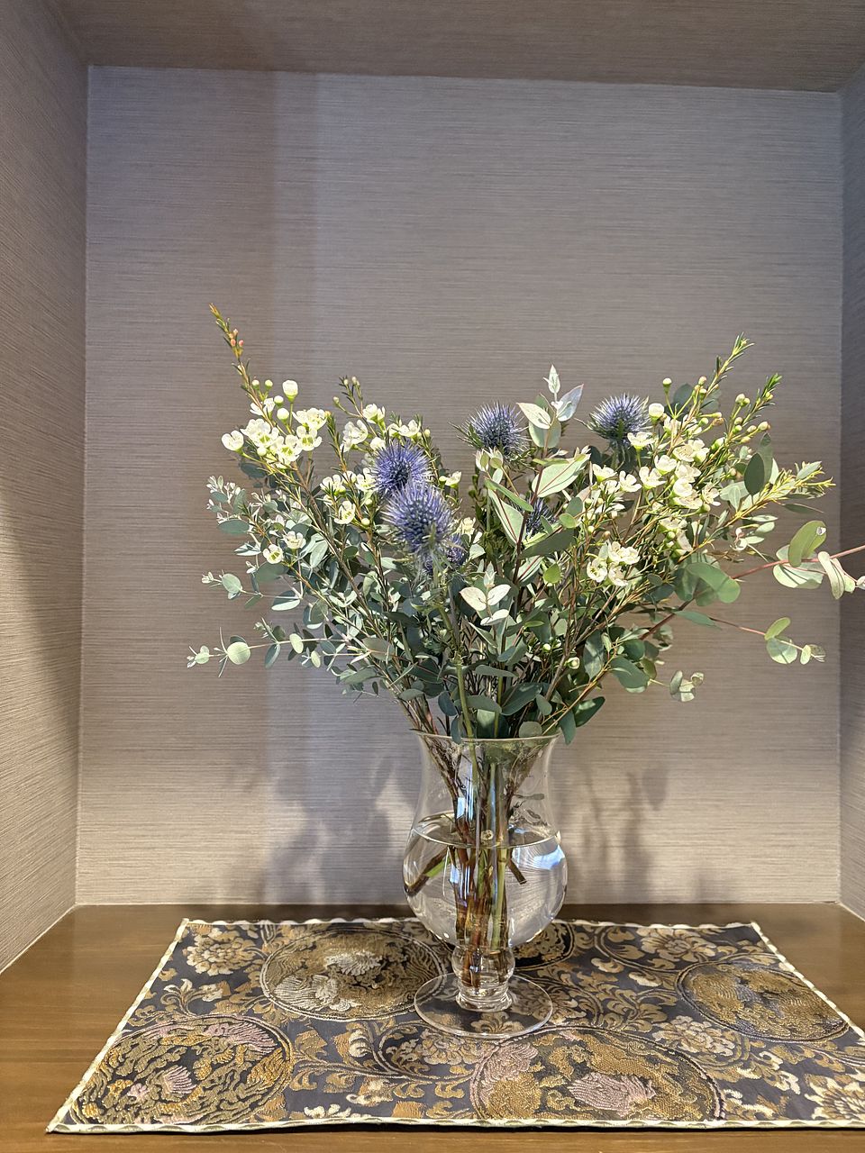 家族に華がないと言われてしまった。確かにユーカリの葉っぱがちょっと緑では無かったりしたので暗い感じだった。 エリンジウムも二本だったからかあまり目立たなかった。