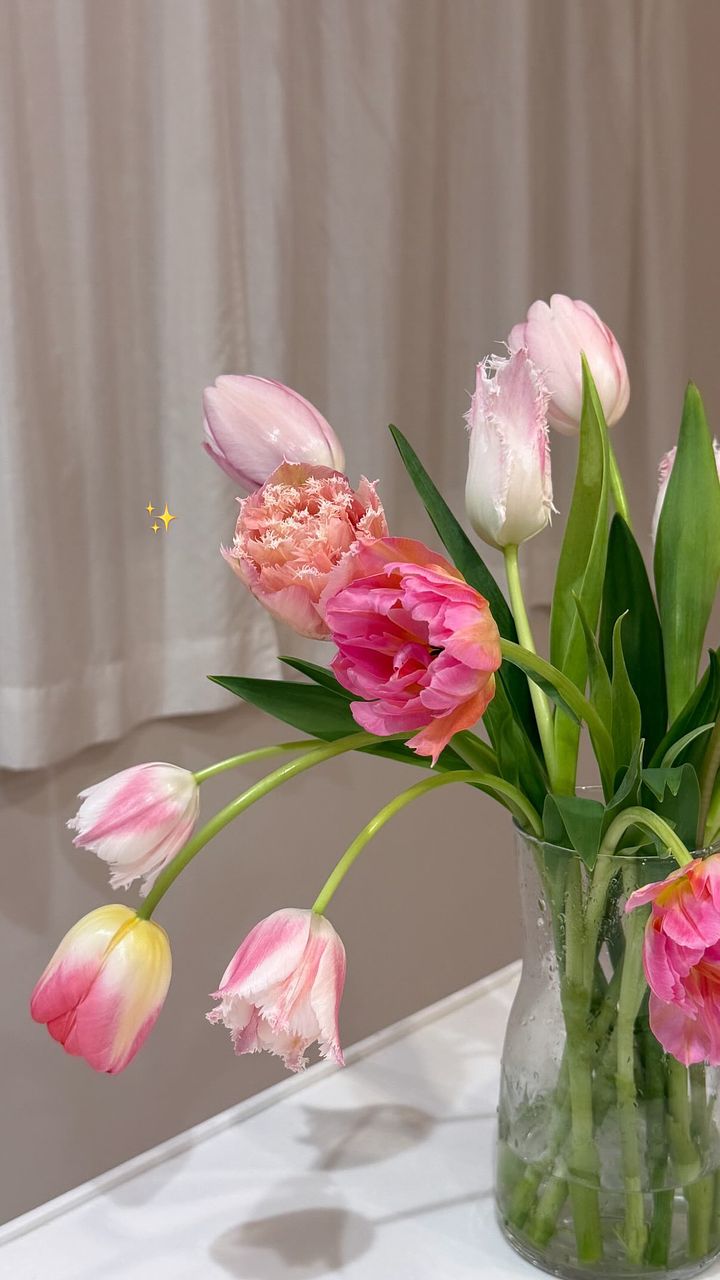 クラウン咲きやフリンジ咲き、八重咲き、一重咲きなどピンク色の様々なチューリップをたっぷりと束ねました🌸
