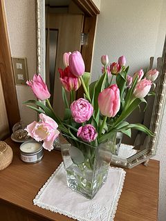 ひとつ折れていたので小さい花瓶に生けましたが 4種類の赤〜ピンクのチューリップが10本入っていて ぜんぶ可愛かったです🌷🌷🌷 なんていう名前かわかりませんが1番開いているお花がとても可愛くて、お気に入りになりました💖 agataのブルーによく合います🩵 もうすぐチューリップの季節が終わるそうなので 他のチューリップも注文してたくさん楽しみたいと思います😊