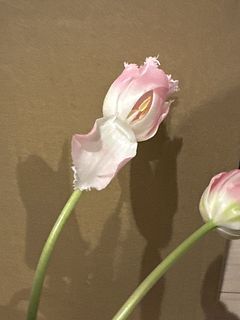 ピンクに白の可愛いおしゃれなチューリップ🌷 部屋の暖かさですぐ開いて可愛いけど、すぐ散っちゃうのかなーと心配したけど、少し涼しい窓際に移動すると夜には少し閉じて眠っているよう🥺暖かさに春だ〜と開いてくれたのかと思ったら愛おしさが増しました🩷🤍