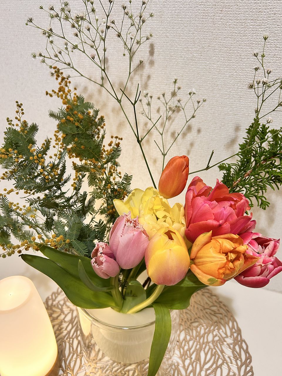 チューリップとミモザが主役の贅沢な春のおまかせブーケはいかが。かわいい組み合わせでお届けします。