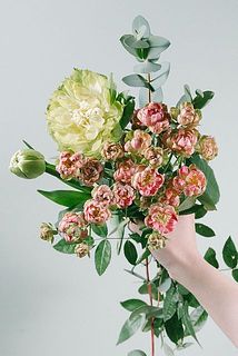 まるで野菜?!くしゅくしゅとしたユニークな変わり咲きローズ「ベジー」を主役にスプレーバラの「ラディッシュ」やチューリップ「アバンギャルド」を束ねた思わず食べたくなるフレッシュブーケ🥦🥕