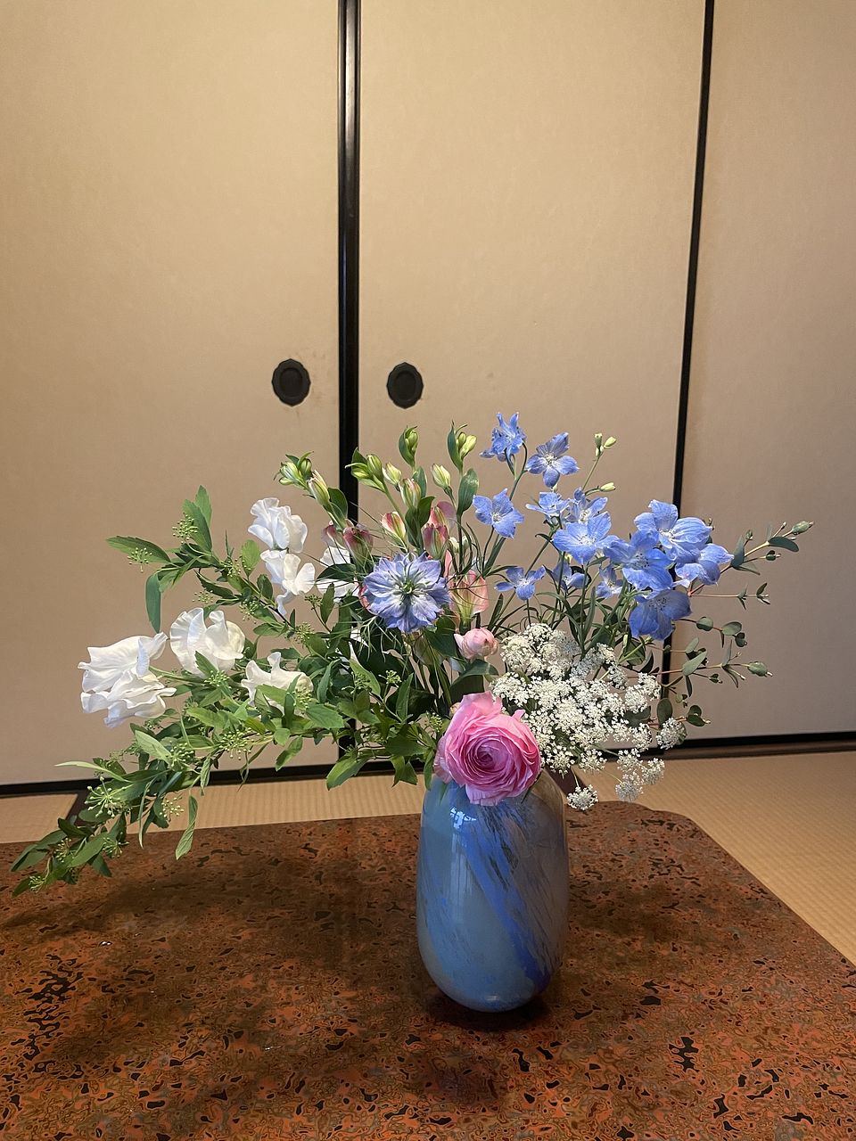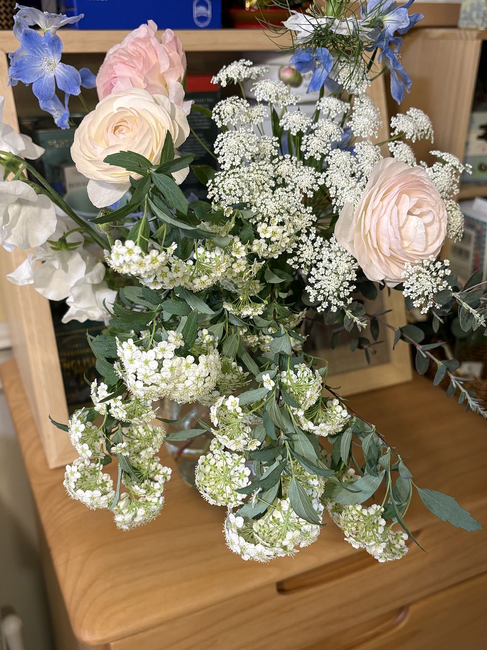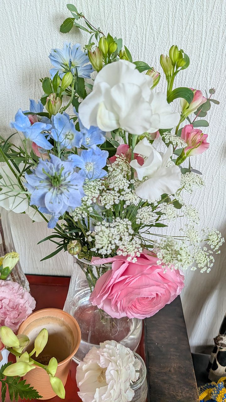 たくさん(10種類?)の花が入っていました バラ、ラナンキュラス、アルストロメリア、スイートピー、サクラ、デルフィニウム、レースフラワー、ニゲラ白と青、ブルースター ボリュームがあります